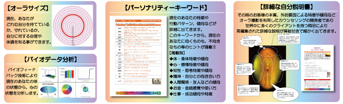 | ●オーラ&チャクラ フルレポート ※アメリカ最新式のオーラ解析機械によるレポート診断 ※簡単な解説付きです ※詳細な説明などご要望の場合は、プラス1,000円で20分、その後10分毎に1000円ずつ料金に加算されてまいります。 ※ 『フルレポート』内容 A4サイズ約28ページ 将来の展望・対人・恋愛関係・仕事と金運・社会生活・健康と成長・心と体などなど(下図参照) |
